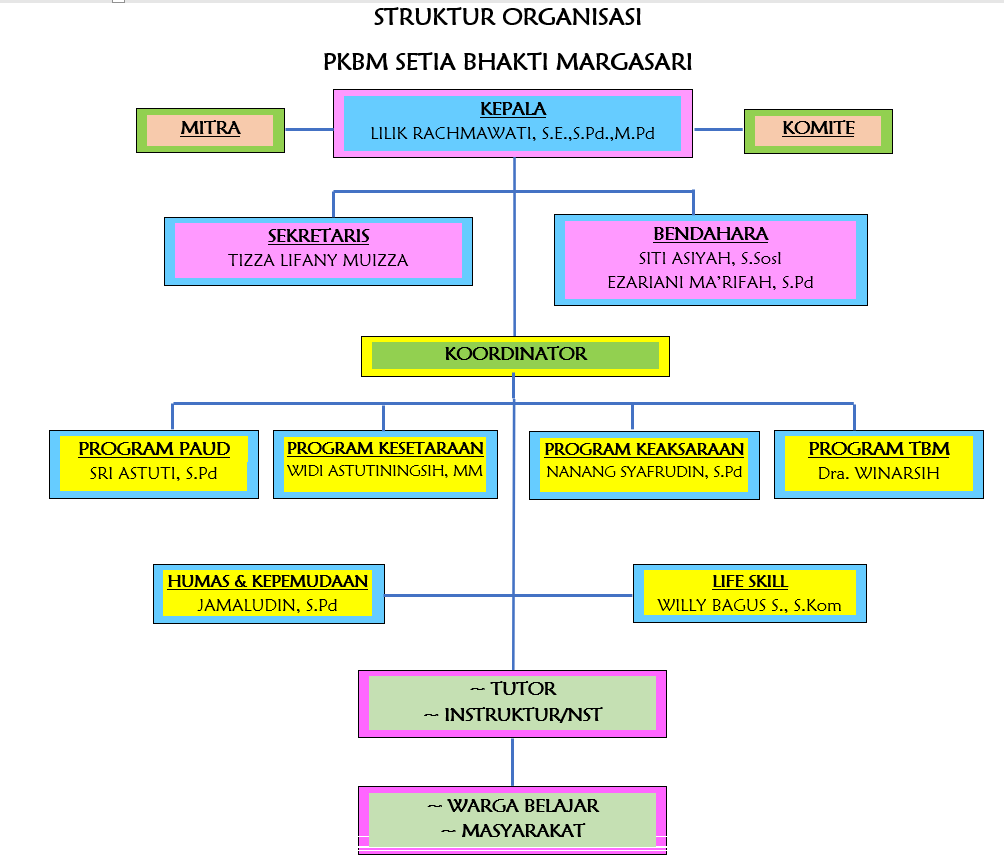 Struktur organisasi ini menggambarkan alur komando, tanggung jawab, dan hubungan kerja antar posisi di sekolah. Berikut adalah susunan struktur organisasi di PKBM Setia Bhakti
